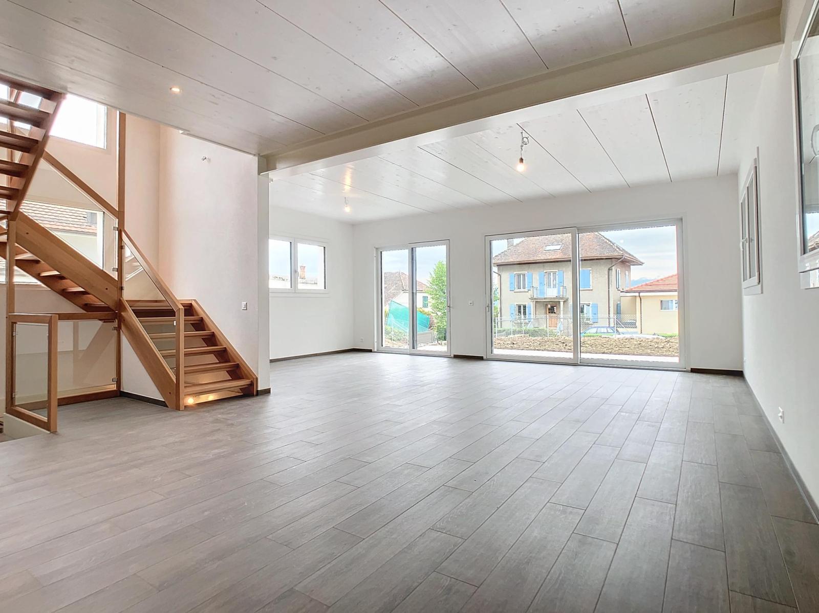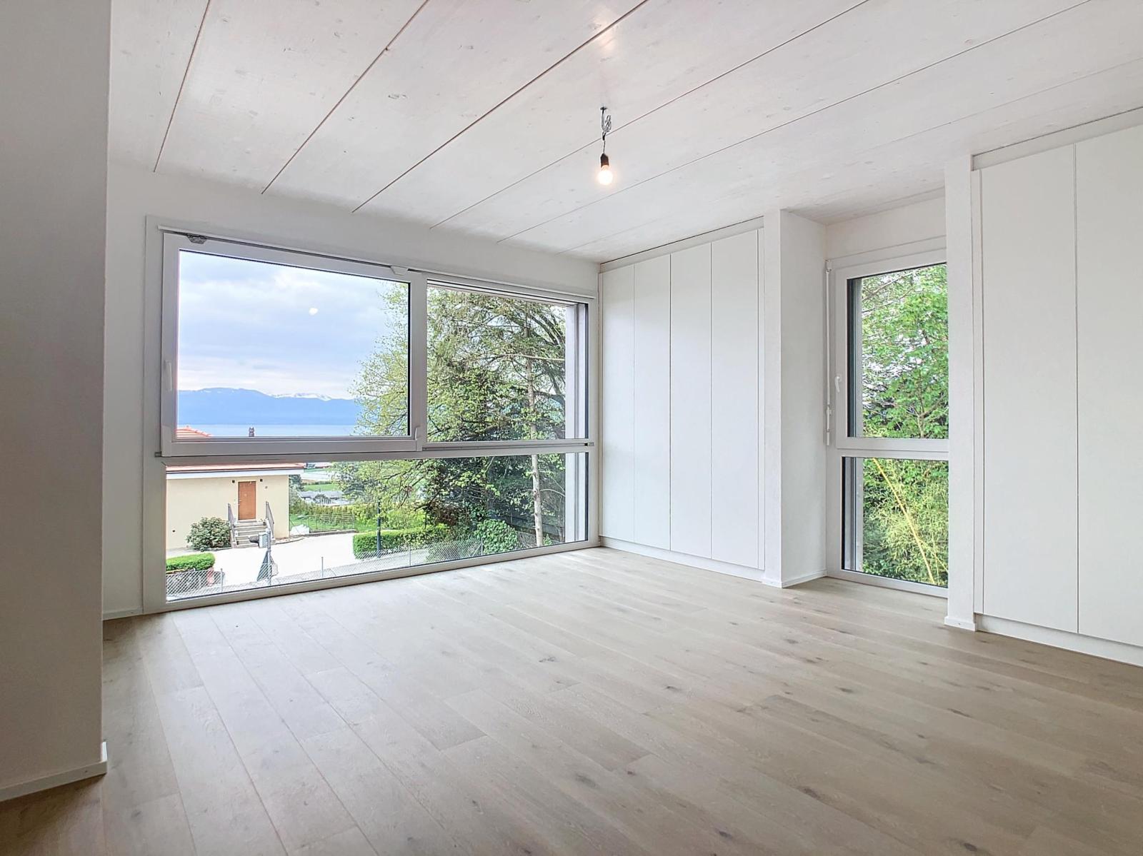 Elle profite d'un garage double et d'un joli jardin orienté côté Alpes avec vue sur le lac Léman.