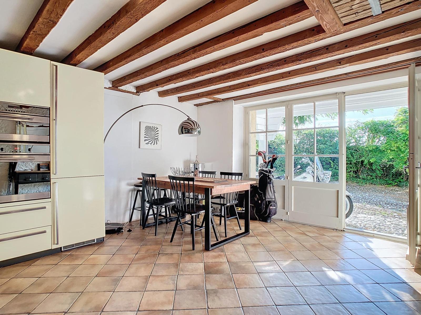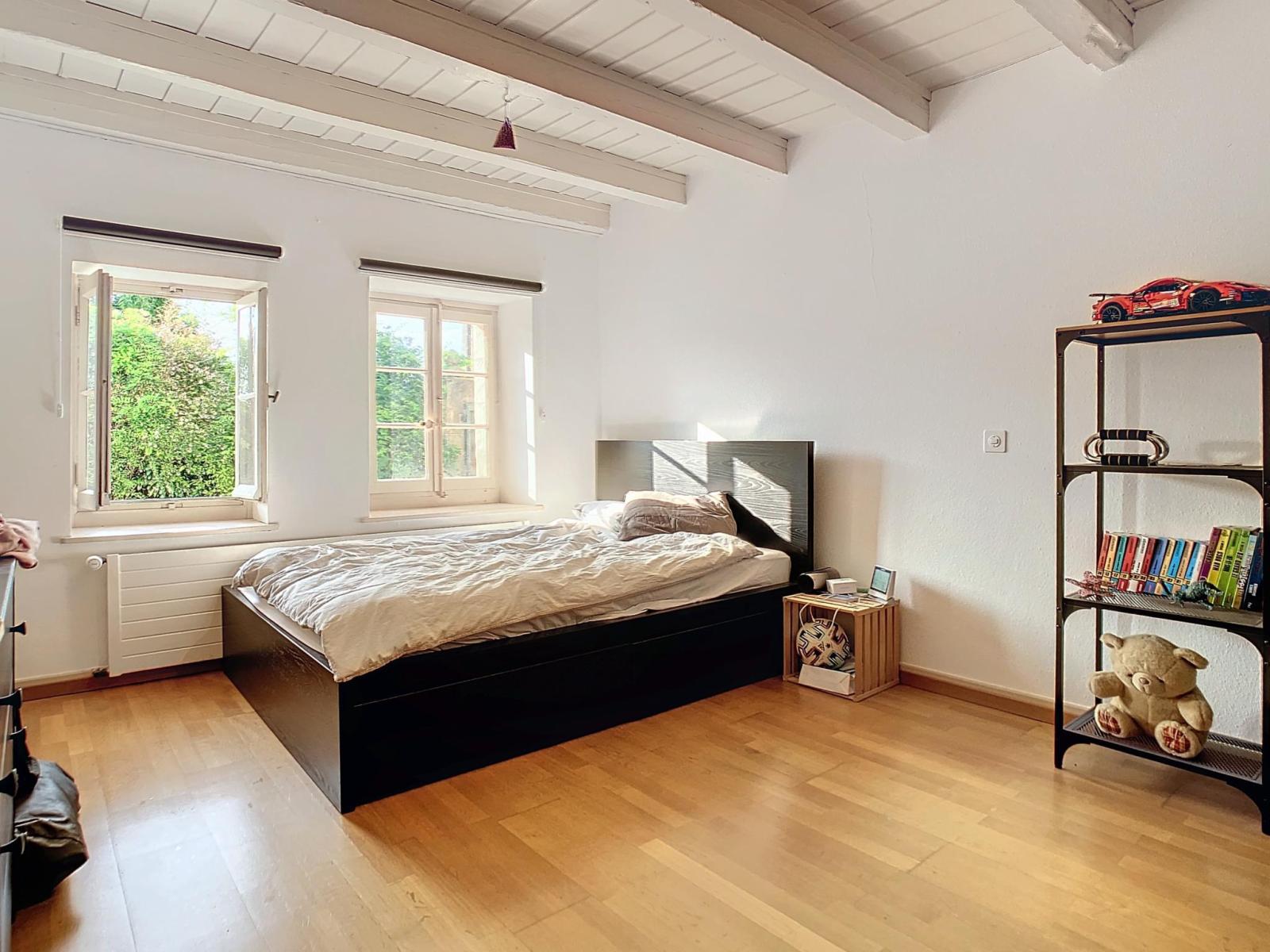 Idéal pour une personne seule ou un couple, cet appartement de 3,5 pièces occupe le rez de chaussée côté Lac et charmera les amateurs de poutres apparentes et de murs en pierre.