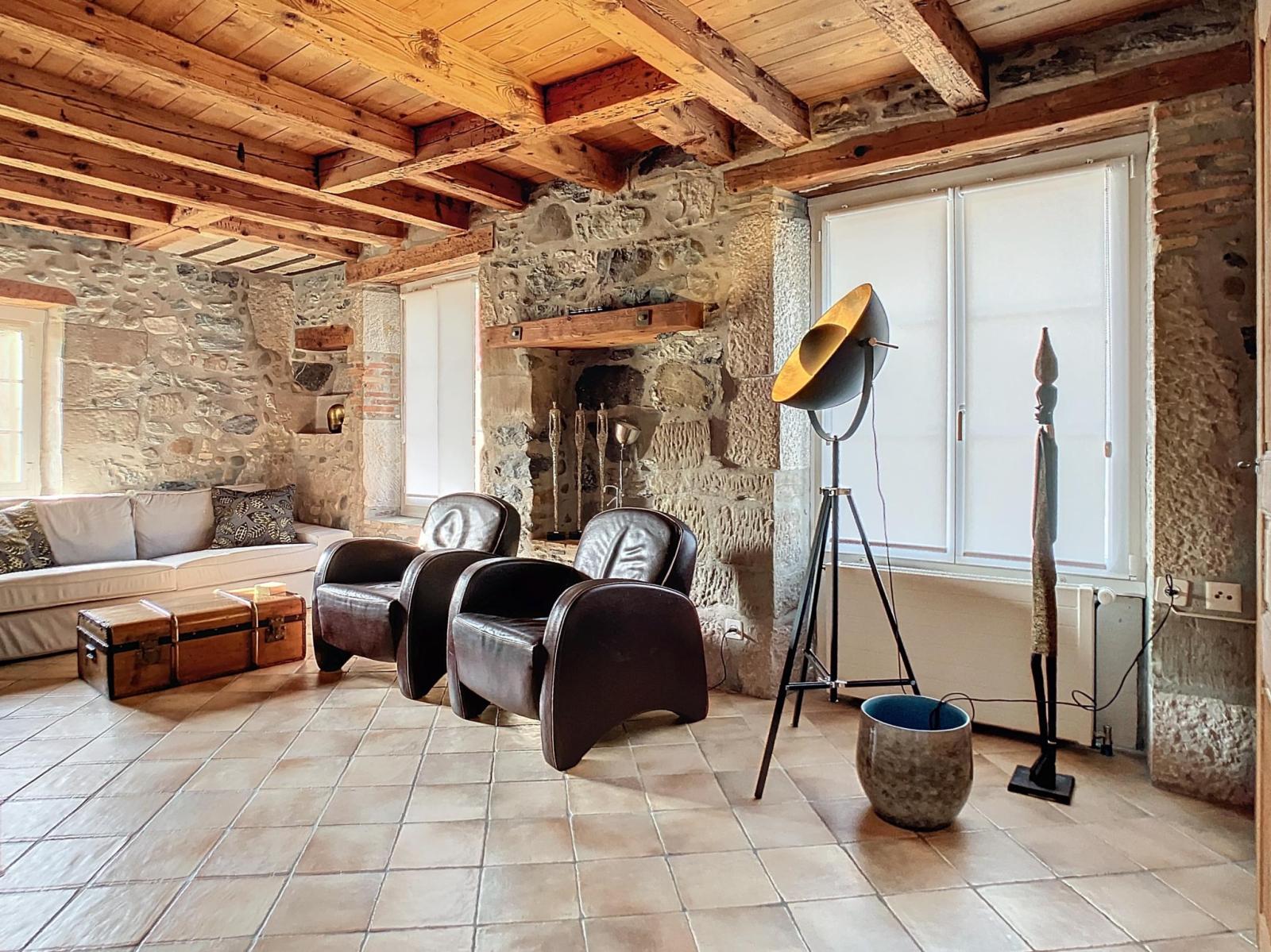 - Séjour avec cheminée et mur en pierre apparentes