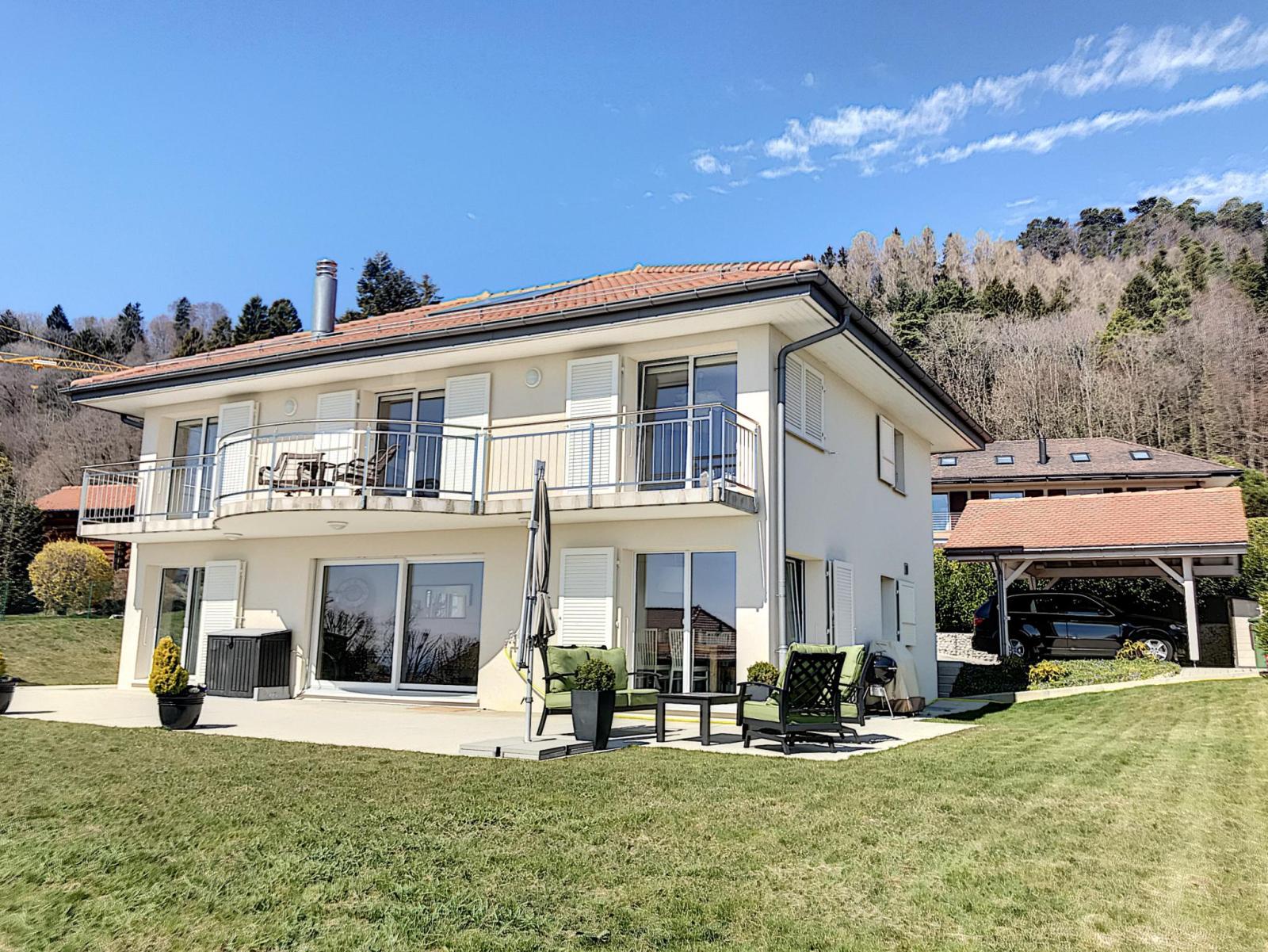 Cette magnifique villa individuelle construite en 2015 est localisée au calme, dans un quartier résidentiel et profite d'une magnifique vue sur le lac et les Alpes.