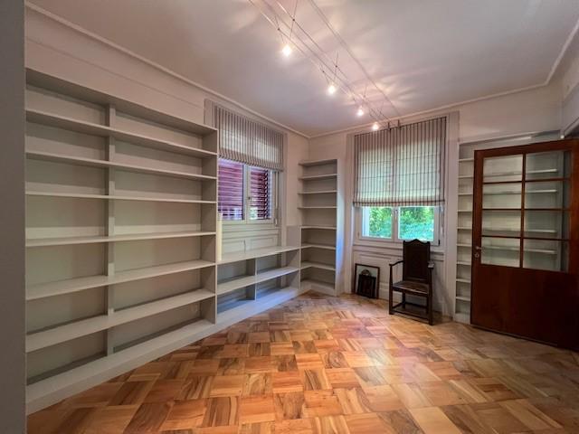 Un grand hall d’entrée avec cachet, un spacieux séjour avec cheminée donnant sur une salle à manger, une cuisine séparée entièrement équipée avec des appareils haut de gamme, un wc séparé, une bibliothèque et un bureau agencé entièrement boisé.